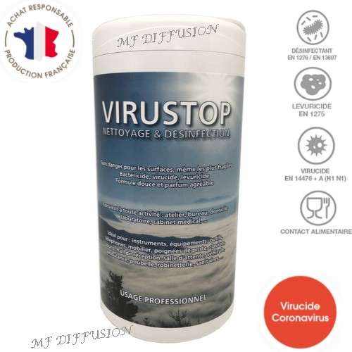 Les lingettes désinfectantes Virustop répondent aux normes poussées de désinfection et sont agrées en contact alimentaire : bactéricide, virucide (EN14476), levuricide, sporicide.